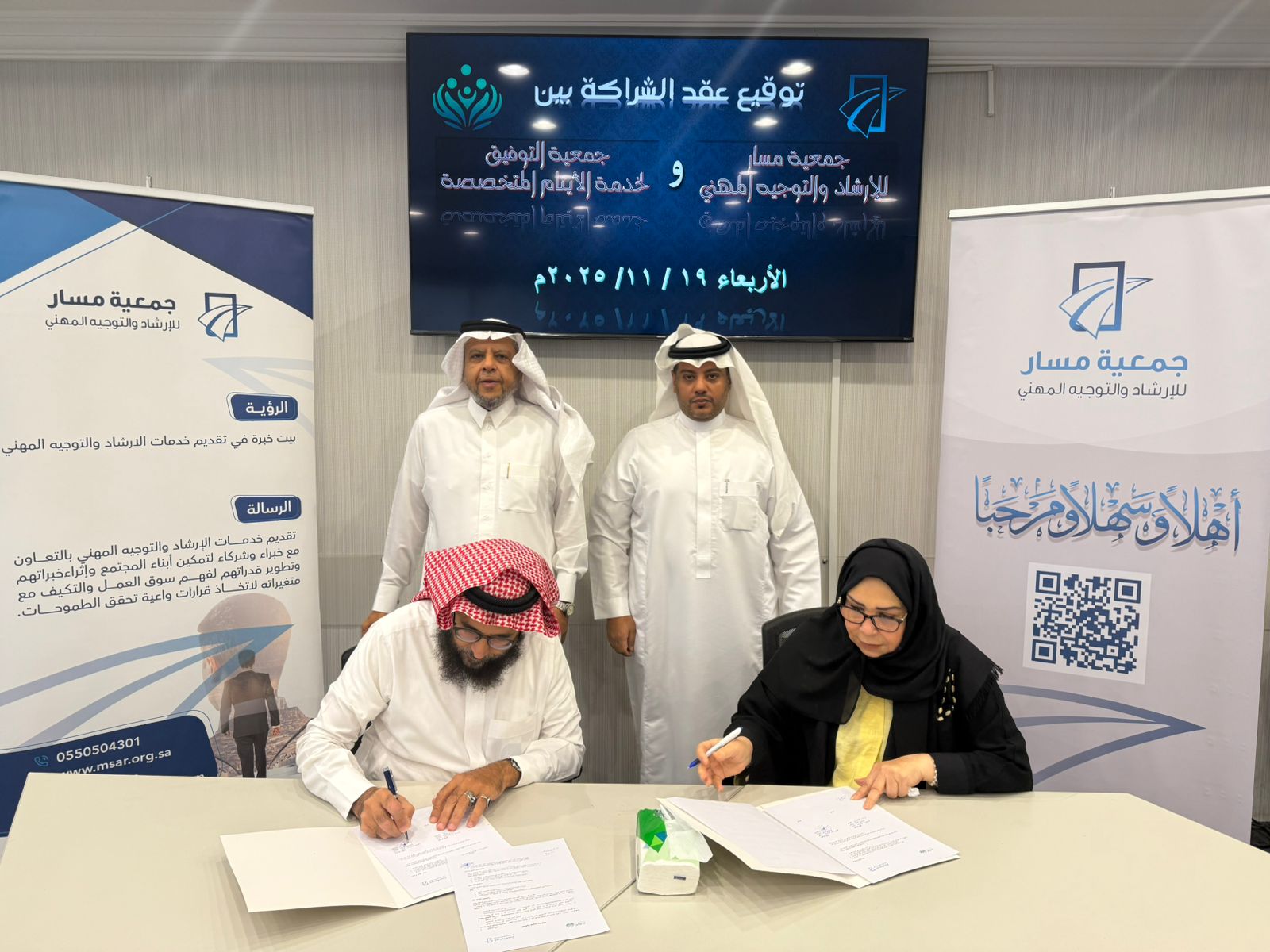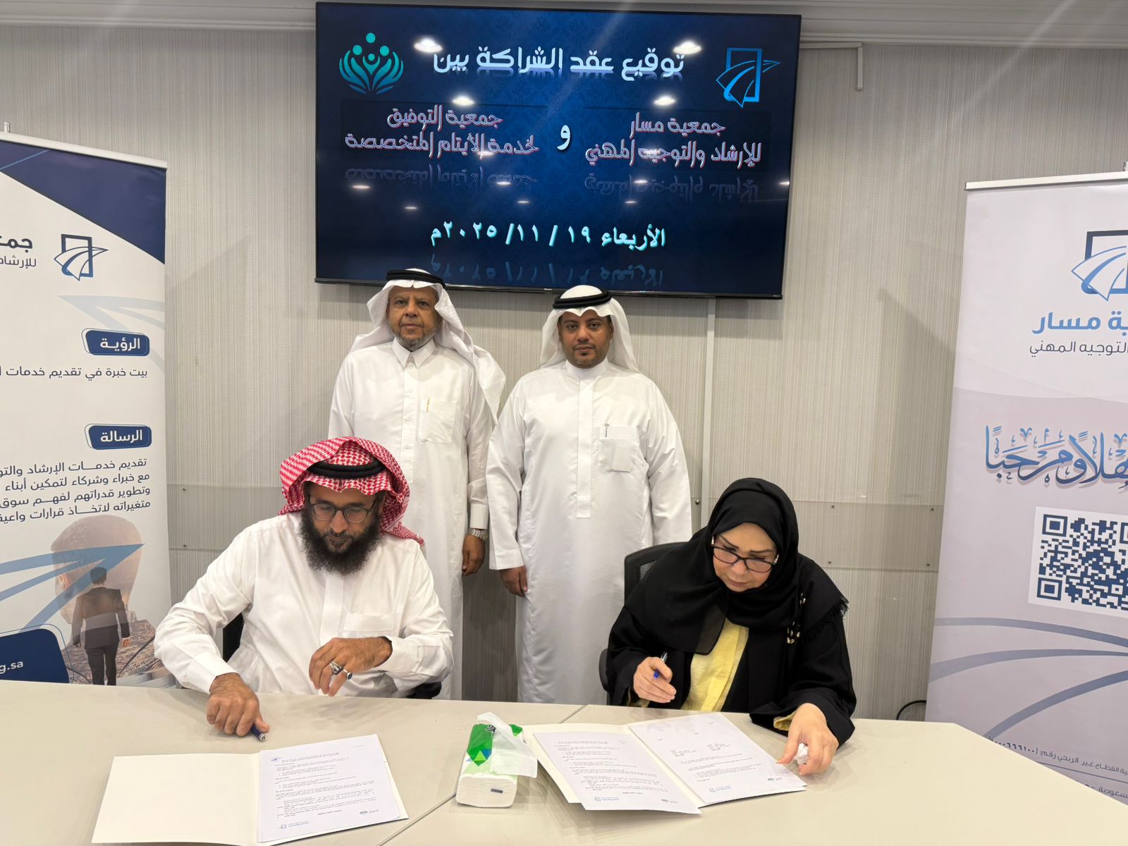 تم توقيع الشراكة بحضور الدكتور توفيق السلمي نائب رئيس مجلس إدارة جمعية التوفيق، ورئيس مجلس ادارة جمعية مسار الأستاذ عبدالله السيود والمدير التنفيذي الاستاذ فيصل الشامي لجمعية مسار، والمدير التنفيذي لجمعية التوفيق الاستاذه نجاة فران حيث جرى خلال اللقاء التأكيد على أهمية بناء شراكات نوعية تساهم في تصميم وتنفيذ برامج مشتركة في مجالات: الإرشاد والتوجيه المهني، التدريب والتأهيل، الدعم النفسي والاجتماعي، وتمكين الأمهات والأبناء الأيتام بما ينسجم مع مستهدفات رؤية المملكة 2030 في تمكين القطاع غير الربحي.