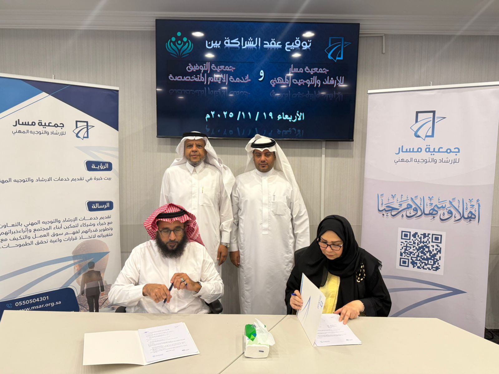 تم توقيع الشراكة بحضور الدكتور توفيق السلمي نائب رئيس مجلس إدارة جمعية التوفيق، ورئيس مجلس ادارة جمعية مسار الأستاذ عبدالله السيود والمدير التنفيذي الاستاذ فيصل الشامي لجمعية مسار، والمدير التنفيذي لجمعية التوفيق الاستاذه نجاة فران حيث جرى خلال اللقاء التأكيد على أهمية بناء شراكات نوعية تساهم في تصميم وتنفيذ برامج مشتركة في مجالات: الإرشاد والتوجيه المهني، التدريب والتأهيل، الدعم النفسي والاجتماعي، وتمكين الأمهات والأبناء الأيتام بما ينسجم مع مستهدفات رؤية المملكة 2030 في تمكين القطاع غير الربحي.