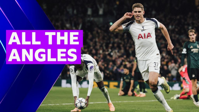 Watch all the angles of Micky Van de Ven's solo wonder goal for Tottenham in their 4-0 win against Copenhagen in the Champions League.